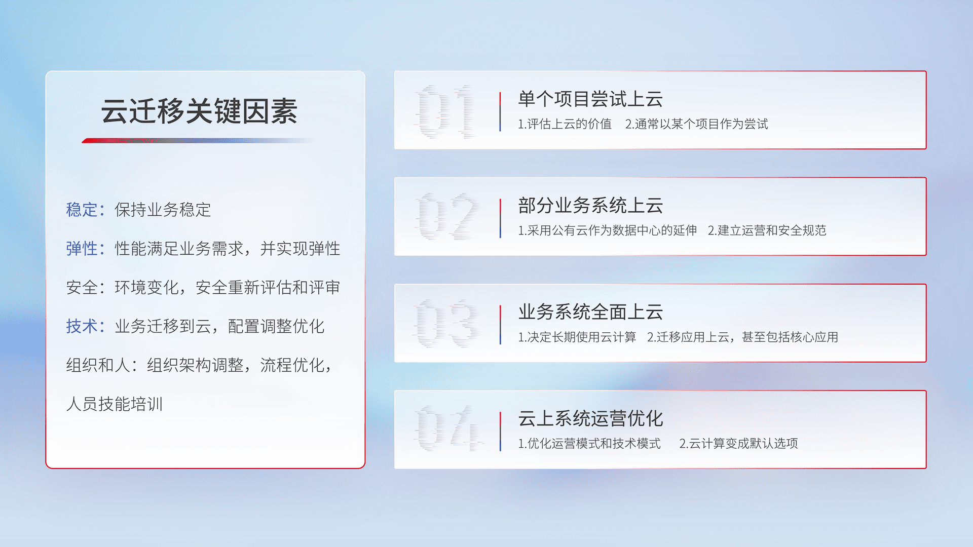 结合实际业务,,,从规划设计、、、、云平台选型、、、、云原生改造、、、、数据迁移、、集成交付,,迁移全过程为客户识别最佳上云路径,,,,做好风险识别管理,,,设计网络架构、、、、身份权限、、、安全审计合规、、、操作审计、、日志审计、、、、监控告警策略、、多站点容灾设计等,,对云上基础设施进行整体规划,,提升IT治理水平,,,,以满足弹性、、、、高可用、、、、高性能的需求。。。。