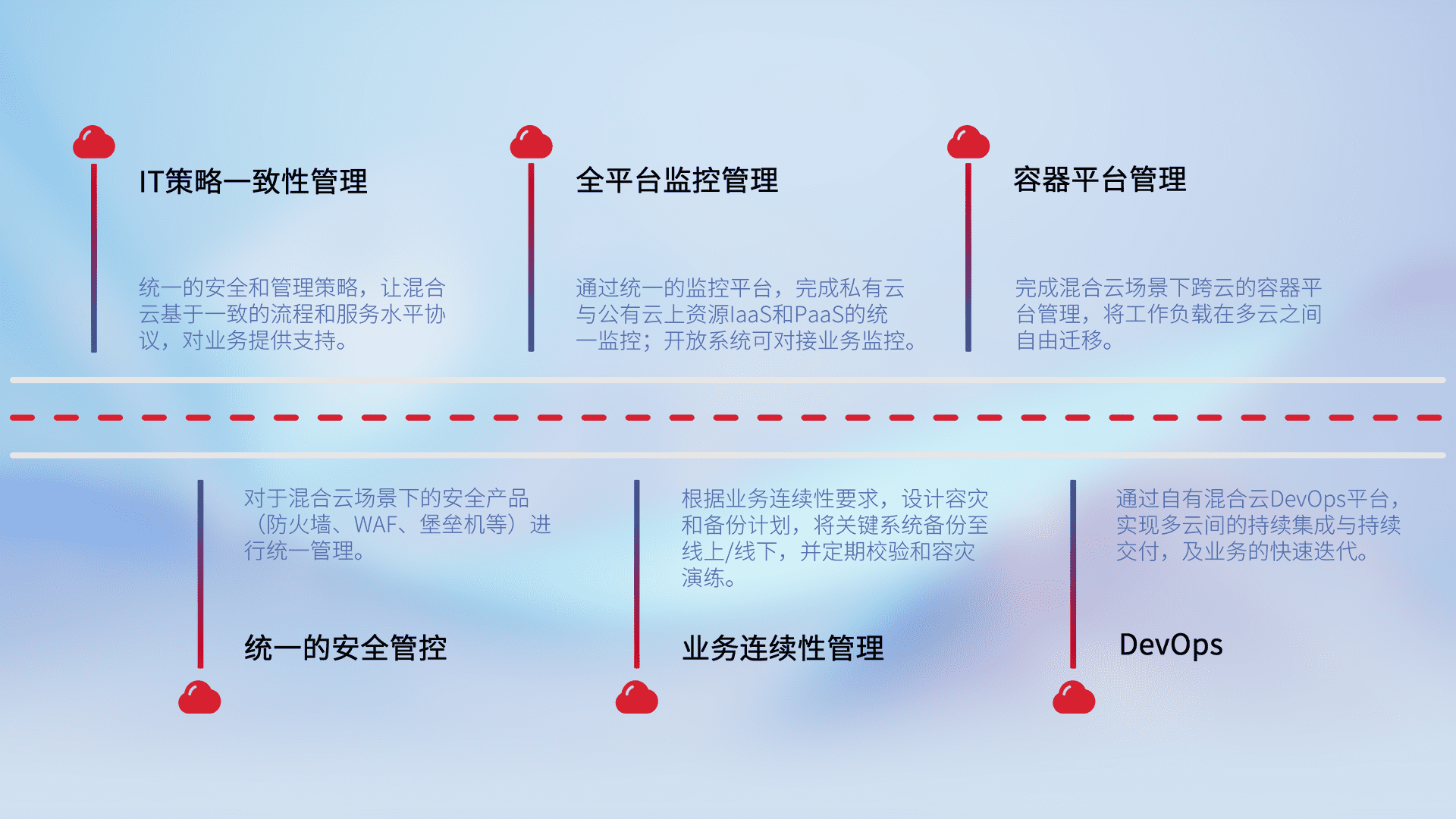 通过多云纳管,,,以统一的资源数据模型把客户的云资源进行抽象和封装,,,进而实现对多云资源的统一操作,,,保障云资源管理的可靠性、、、稳定性与可用性。。。量身定制化运维内容,,,配置、、、、开发运维、、、补丁管理、、备份、、、、监控、、、、认证和访问管理、、、审计和日常巡检等,,,保障在用云过程中的可靠度,,,稳定度以及高可用率。。。。