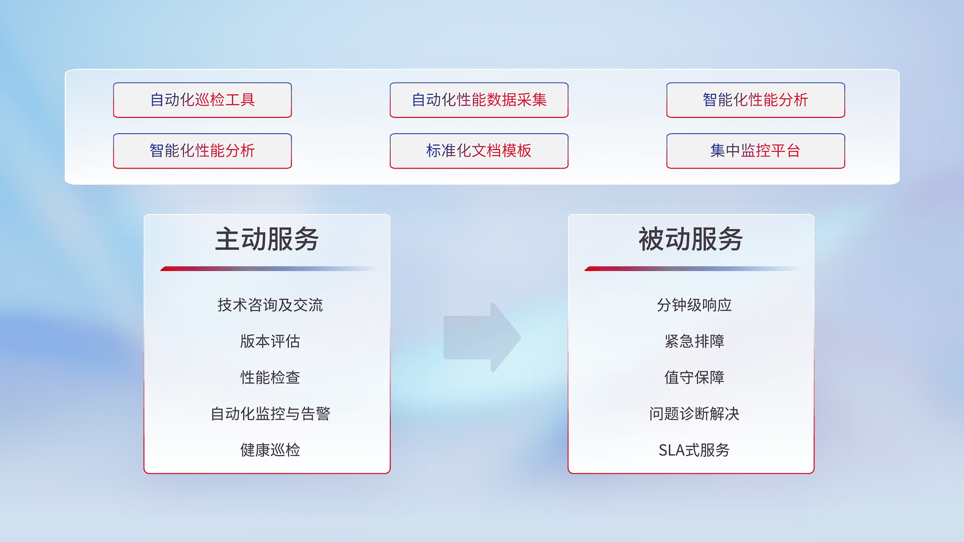 智能化工具和标准化文档,,,,保障服务质量,,提供主动服务(包含技术咨询、、、、版本评估、、、性能检查、、自动化监控与告警、、、、健康巡检)和被动服务包含(分钟级响应、、、、紧急排障、、、、值守保障、、、、问题诊断解决、、SLA服务)。。。