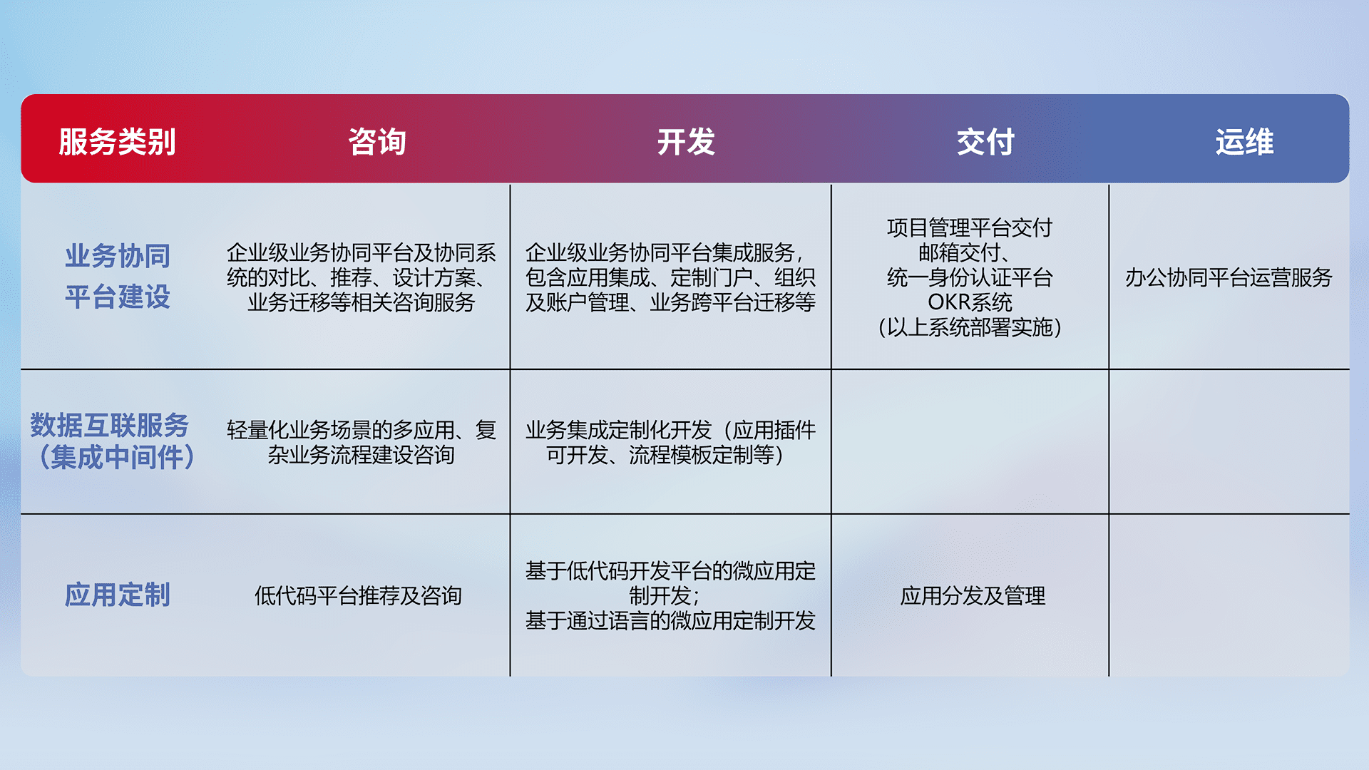 针对钉钉、、企微、、IDaas等平台级产品提供产品的规划、、方案、、、、交付、、定制化开发等服务,,实现如统一协同办公、、、智能客户服务、、混合会议管理、、、、智能数据查询、、、等业务场景,,实现数字化转型。。。。